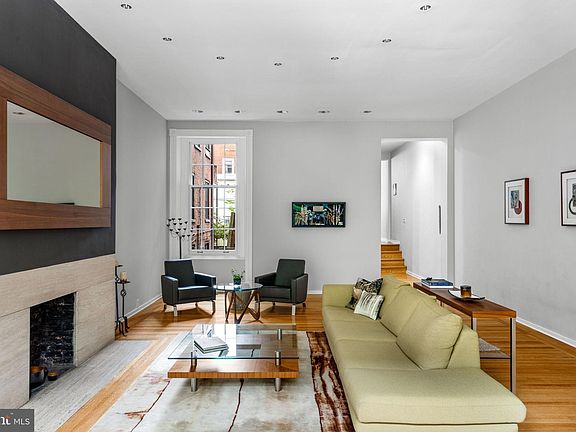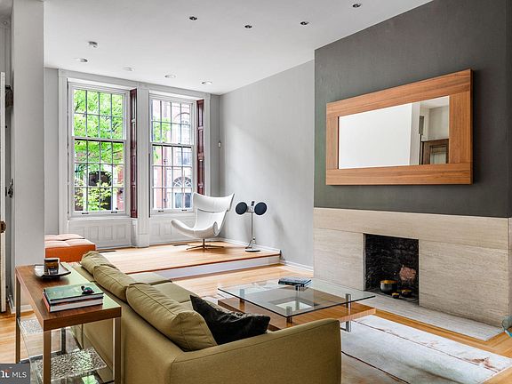 Welcome to 2128 Spruce Street in Fitler Square! This stately, modernized 5-bedroom townhouse sits 20 ft wide on a 105 ft lot with high ceilings, hardwood flooring, and original details. Enter through the vestibule into a spacious, light-filled living room with 12 ft ceilings and a sleek contemporary fireplace. Just off the living area are a discreetly located powder room & two large coat closets. The eat-in kitchen is also on the main level and features a large chef's island with butcher block countertops, maple cabinets with stainless steel counters, and stainless appliances. The dining area is open to the kitchen with a wood-burning stove, and south-facing windows overlook the spacious back terrace. A charming center staircase takes you up to the next level of this home, which is equally as grand with a handsome library in the rear that features a fireplace and beautiful built-in bookshelves, a full bathroom with a shower and pedestal sink that has access from the hall as well as the library. An elegant primary suite completes the 2nd level with a fireplace and built-ins. It features an en-suite dressing room with a walk-in closet and a contemporary bathroom with a seamless glass shower, soaking tub, mosaic tile flooring, and an oversized single vanity sink. Two guest rooms with a hall bathroom plus a home office and a laundry room are located on the 3rd level, with two additional bedrooms (one is used as a home gym) and a hall bathroom on the 4th level. The garden level features a full studio with direct access to the back terrace. This space is perfect for a home gym, guest suite, artist studio, rec room, or play space. Located in the Greenfield School catchment, this property is situated between Fitler Square Park and Rittenhouse Square. It offers easy access to the Schuylkill River park and trails, 30th Street Station, Penn, CHOP, and Drexel, and nearby neighborhood favorites, restaurants, and retail. Seller is offering 1-year prepaid parking at a nearby parking facility.