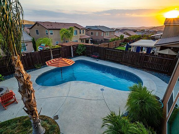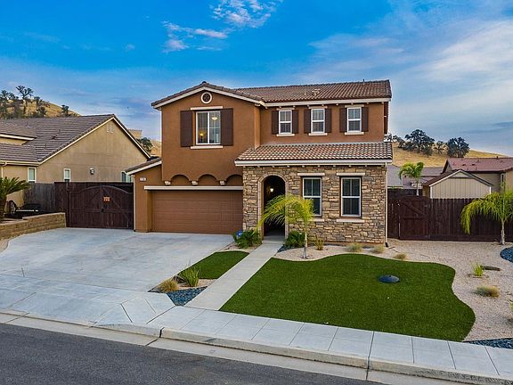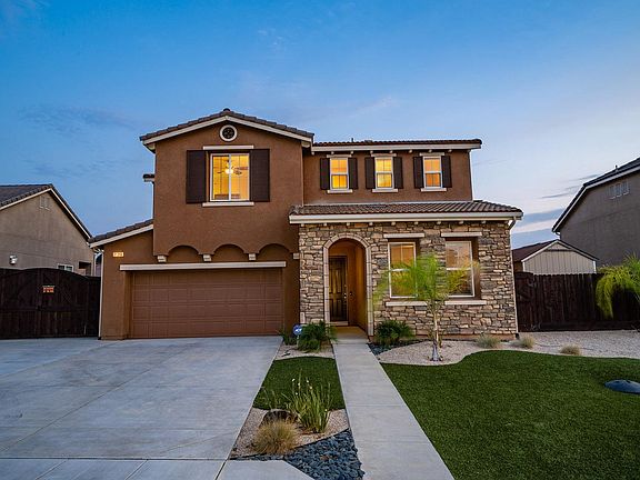 Only 15 minutes to Riverpark, and Clovis schools! Gorgeous 5/3 with gorgeous views of surrounding foothills and even city lights. Open kitchen with stainless appliances, granite counters, pantry, and gas stove. Living area has a gas log fireplace, and lot of windows, bringing the views inside. The master has wonderful views to the south, and a balcony with city light views. Master bath has a soaking tub and separate shower, and a huge walk in closet. Outside are RV parking with beautiful gate, fenced pool with shallow play area, fire pit and grassy back yard. There is a 12x5 custom sandbox, a large new shed, and wiring for a spa. (existing spa does not stay.) Landscape includes synthetic grass in the front, and gorgeous Blue Pascano rock in the front and the back. Lots of storage, huge closets, and many more upgrades. One bedroom and bathroom are downstairs, all of the rest are upstairs. Finished garage with workbench and cabinets, storage racks and sealed floor.
