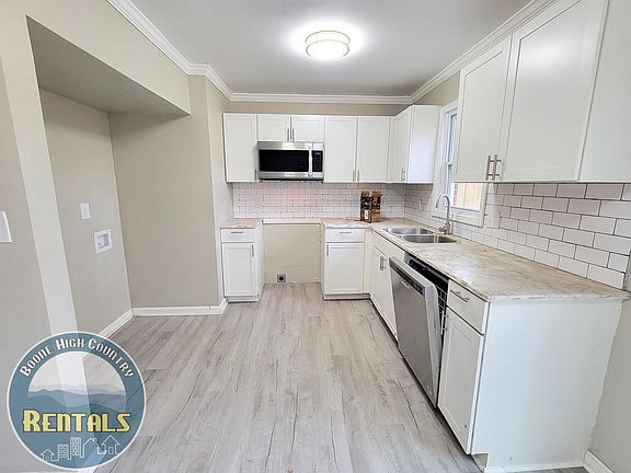 Welcome to our newly renovated 1-bedroom apartment in the beautiful location of Boone, NC. Experience the best of Boone living in this newly renovated apartment with all the amenities you need for a comfortable lifestyle. Located just off old 421, you'll have convenient access to Boone. You'll find an open floor plan with lots of natural light through the front door. This apartment offers a modern and stylish living space, perfect for those seeking comfort and convenience. The kitchen is equipped with stainless steel appliances, adding a touch of elegance to your cooking experience. Each unit has its own sliding glass door to a patio and quaint fenced-in yard. Upstairs, you'll find both rooms with a shared bath. The primary bedroom features his and her closets along with an additional closet for storage. There is another room perfect for your home office. The bathroom features a tub/shower combination with subway tile.