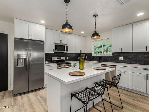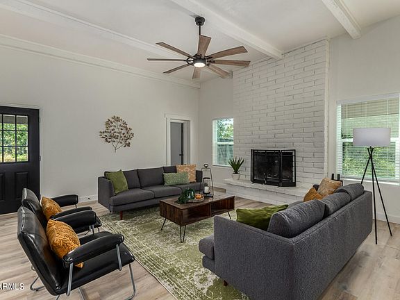 Oversized backyard! Beautiful remodeled 4 bedroom, 2 bathroom property nestled in Mesa. Discover an impressive interior showcasing gleaming wood-look flooring, a fresh soothing palette, high-vaulted ceilings, stylish light fixtures, & a delightful fireplace. The gorgeous kitchen is ready for you to cook your favorite meals, offering quartz counters, stainless steel appliances, a custom tile backsplash, white shaker cabinets¢er island equipped w/ a breakfast bar. Master reveals a generously sized room, large custom shower, & direct access to backyard.Enjoy outdoor entertaining in spacious backyard, featuring covered patio & picturesque blue skies, grassy area & plenty of room to create your dream oasis.This beautiful home is waiting for YOU! See doc tab for list of remodeled items.