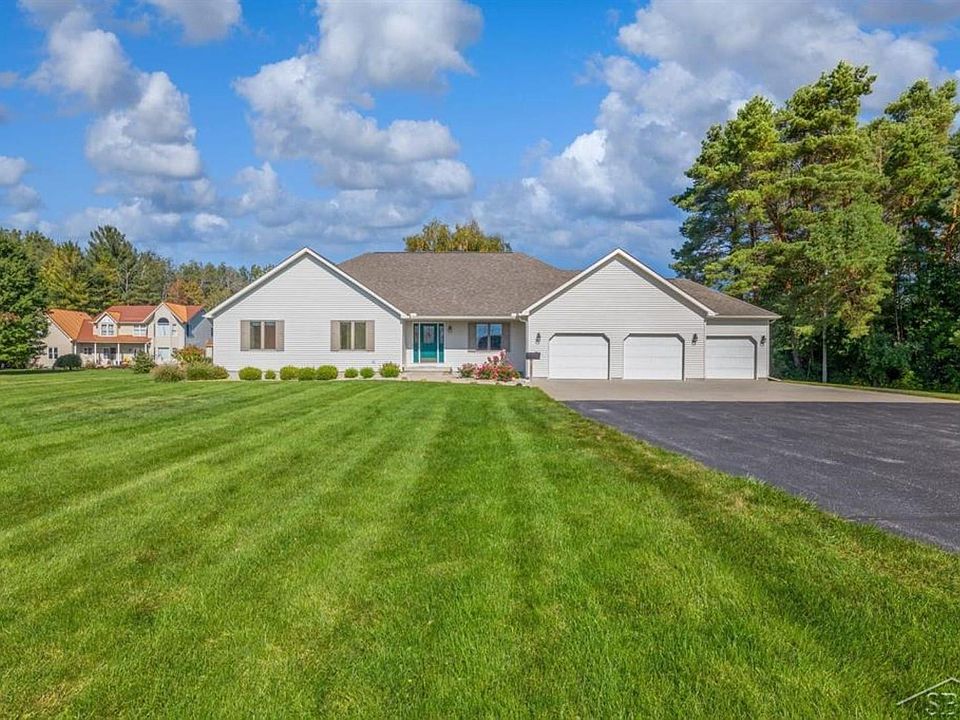 A SPECIAL PLACE ON STEWART ROAD | Situated on almost 2 acres in the desirable Bullock Creek area just minutes outside the city of Midland, you’ll find this stately home with beautiful curb appeal. This lovely custom-built ranch offers over 2,600 square feet of living space with 3 large bedrooms, 2 full bathrooms both with double vanities and 1 half bathroom. A primary bedroom en suite incorporates both a jetted tub and standing shower in the bathroom, alongside the spacious walk-in closet. There are so many wonderful qualities of this home, namely the large great room with vaulted ceilings and cozy gas fireplace immediately visible upon entering the front door, both a breakfast nook and formal dining space, and an additional family room off the kitchen dining area with the best backyard view! That’s not to mention the huge three-bay garage with additional access to the sprawling basement with high ceilings and egress window, and an incredible amount of storage space overall. A very purposeful design can also be seen throughout this home, right down to the practical placement of light switches and electrical outlets. Wide hallways and doorways, and a large laundry space set off the garage entry, give thought to aging-in-place comfortably. The South facing paved driveway and front walk can be a benefit in winter when the sun can more quickly melt any ice that might try to linger. Additional features of the home include the high quality Marvin windows, walk-in pantry, beautiful locally-milled wood work throughout, an extensive sprinkler system connected to the well, large composite back deck, an Amish-built high barn storage shed with new siding and doors, Atlas Pinnacle Laminated Architectural Shingle roof completed in 2017, complete gutter guards, new landscaping by Maple Hill Nursery, city water and natural gas! What has lovingly been referred to as the Jewel of Stewart Road may just be the perfect fit for your new home. Don’t wait, book your showing today!