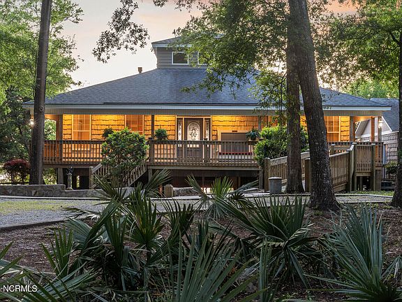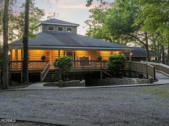 This custom-built home rests on a hill overlooking salt marsh & the Shallotte River. From a covered porch or an expansive lower deck, enjoy a stunning view clean around to where the river meets the ICW. Its 2.5-story living room is supported by large corner Juniper beams cut & delivered from a Vermont sawmill. Watch the flames flicker in an olden day's gas log stove as it ushers out the morning chill. Everything - from a massive Wolf gas cooktop stove in the kitchen, to an art studio & separate woodworking shop below, to a large indoor heated lap pool with a full-size pool table next door - invites you to pure luxury in a cabin-like setting. The kitchen island is a large cutting board for food prep. A second bar adds seating to enjoy marsh views as well as additional storage. Pocket doors allow better furniture placement. A wood-encased etched glass knee wall separates the lap pool from the pool table area. Original Native American photos, an antique fly rod & other gear adorn the pool house cedar walls. Cleaning is less of a hassle with a whole house vacuum. Newly painted interior & power washed exterior give the home a fresh clean look. Duct work was cleaned, & HVAC (house) & split system (pool house) were recently serviced as was the lap pool. Below is ample parking - out of the weather - for 3 SUVs. The Koi pond - left of the house - is ready to be filled & stocked. Well thought out features complement the property like the oversized banister at the covered porch to rest your cocktail & dinner with a large overhang. A nearby community pier provides private access to the ICW where watercraft – work & play – are active each day. With so much more to experience, come see why this should be your oasis for making memories.