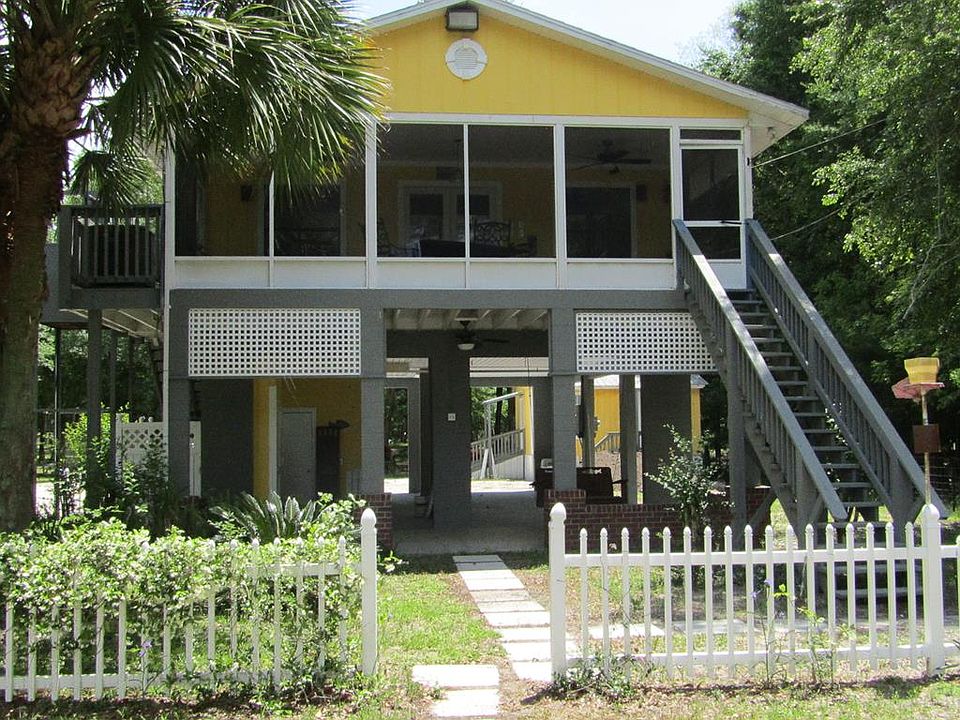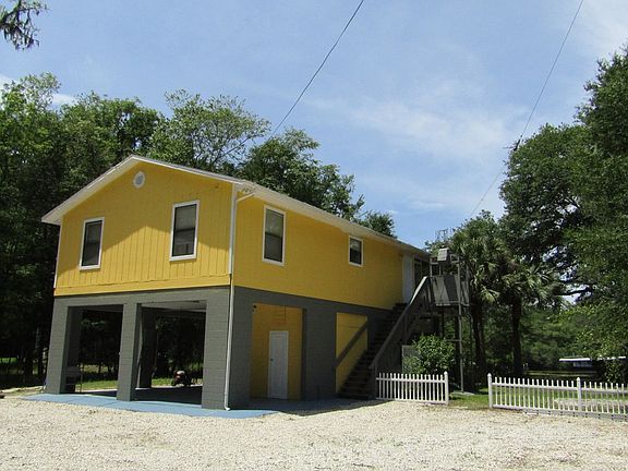 Soak up the water views and sunsets from the riverside screened in porch on this adorable 2 BR , 1.5 bath stilted home on the banks of the Suwannee River! Enjoy fishing, boating, swimming, and your natural surroundings on this 1.47 acre wooded riverfront parcel. This home has been recently updated and is as cute as a button! The home features an open floor plan with water views from the common areas and the screened porch, and a freight elevator. Upstairs you will find 2 bedrooms and 1 bathroom, an electric fireplace, and a laundry closet. Downstairs is a great covered seating area, storage or parking and another 1/2 bath. A small detached guest cottage will help to accommodate more friends/family. There is also a gazebo/summer kitchen at the rivers edge, as well as a floating dock! This property would make a great vacation or retirement home, and/or a vacation rental. Bell is a friendly rural community with A rated schools and many fresh water springs. Call today!