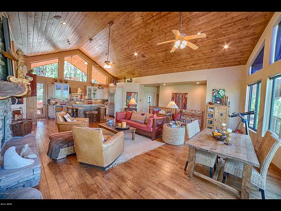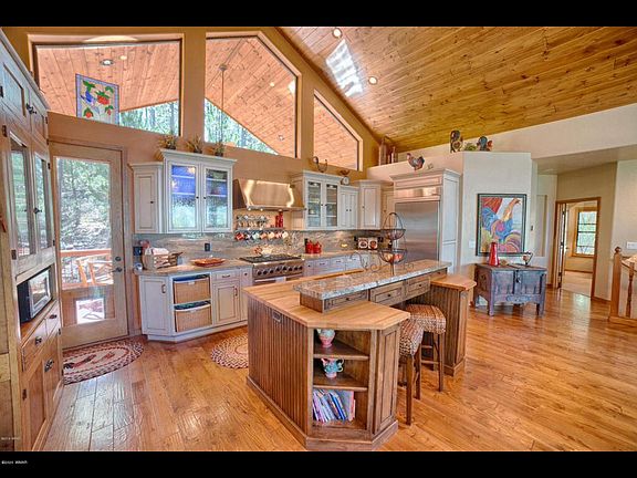Welcome to this stunning, one of a kind, custom mountain retreat that is situated on a private .57 acre with expansive views. Every detail was carefully selected and quality crafted. The paradise in the Pines is located on a hillside with two levels, sporting sunset views from nearly every room. The main level boasts vaulted T&G ceilings, hardwood floors and a wall of windows overlooking the treetops. Included in this gorgeous space is the great room with a dry-stack see-through fireplace that invites you into the formal dining room with a large built-in wine cooler, the chef's kitchen with SS appliances, a built-in refrigerator, a six-burner gas stove, custom cabinetry, an island and granite countertops and a guest bedroom with a private deck and guest bathroom.