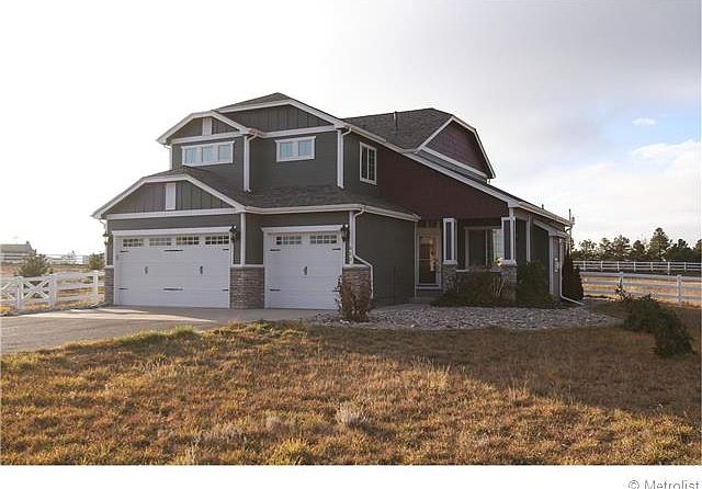 Nestled in the rolling hills, just minutes from downtown Parker, this lovely modern home sits at the end of a cul de sac on a fenced 1.5 acre lot with mountain views. A freshly painted exterior has a gorgeous curb appeal and includes a 3 car garage, paved driveway, drip line fed shrubbery and an adorable front porch. At the entry, you are greeted in the foyer by gleaming hardwood floors and soaring vaulted ceilings. 9 foot ceilings are the lowest you?ll find on this floor! A curved staircase i