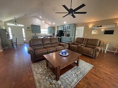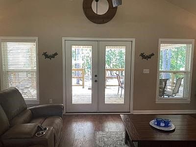 Custom well-built home on beautiful Lake Eufaula featuring 3 bedrooms and 2 baths. The living area is open to the kitchen, boasting granite countertops and a large island. The split bedroom design ensures privacy. The owner suite includes a walk-in laundry room, a bath with double sinks, granite counters, a large tiled shower, and a walk-in closet. The second bath offers granite countertops and a tub/shower. Enjoy the beautiful hardwood floors throughout. Large windows in the living area overlook a covered porch with stunning water views. The lakeside covered porch is ideal for morning coffee. This property includes a platform dock on Gin Creek, renowned for excellent fishing. Located in Indian Hills, which is restricted to site-built homes.
