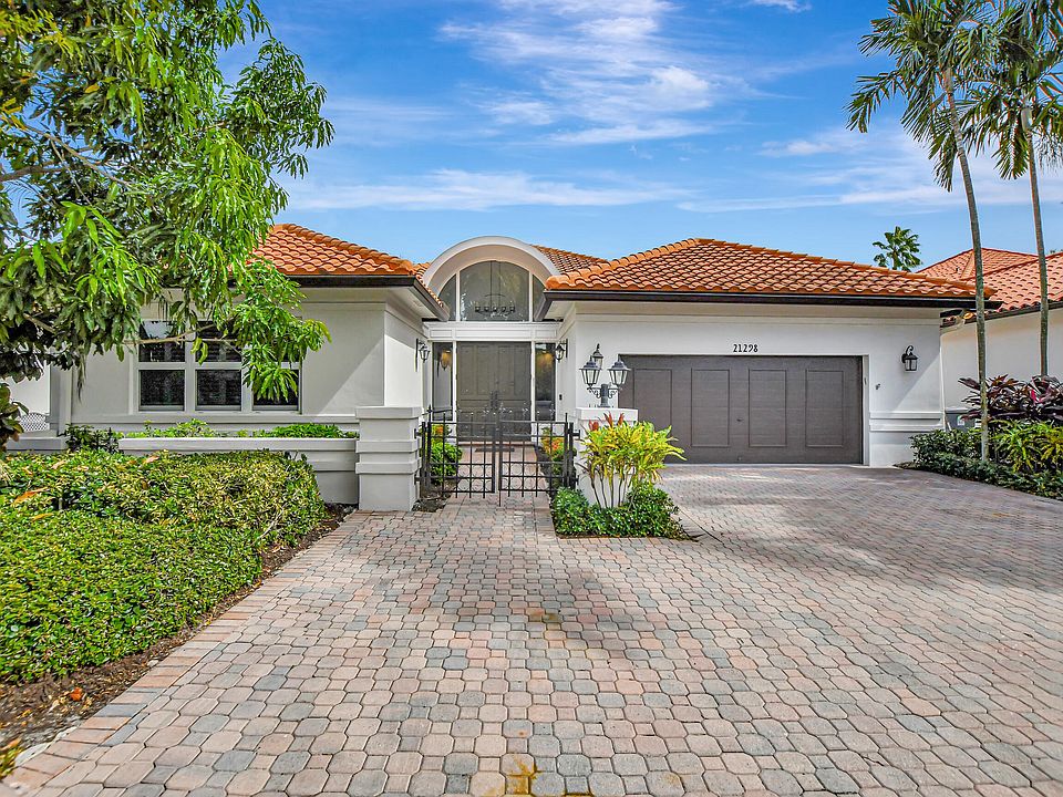 Stunning single-story home on a golf course. Open floor plan with split bedrooms. Impressive upgrades including impact glass, generator hook-up, and newer roof. Luxurious master bedroom suite with separate dressing area and lavish master bath. Guest bedrooms with their own bathrooms. Fully equipped kitchen with top-of-the-line appliances. Great Room with wood cabinetry, custom bar, and a sub-zero wine cooler. Electronic shades in master bedroom and Great Room. Retractable awning for convenience. Pool and patio with golf course views. Boca Grove is a prestigious country club community with mandatory membership. Fee schedule available upon request.
