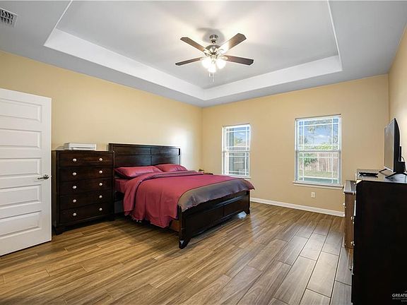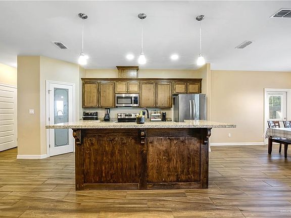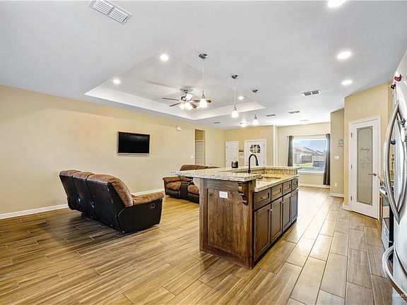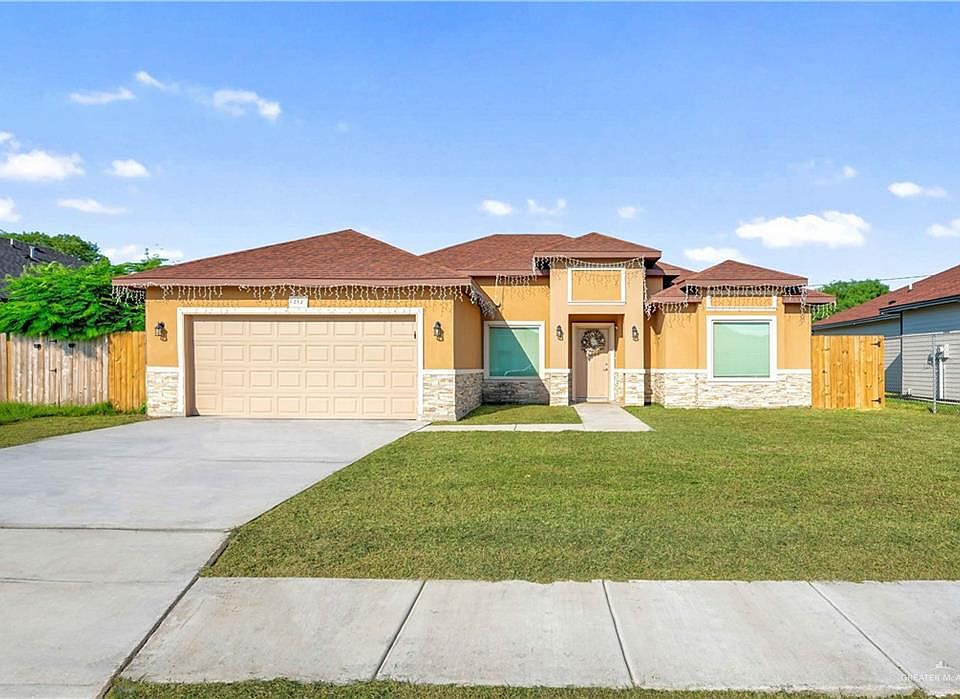 Beautiful Open-Concept Home in Mercedes, Tx. Welcome to this stunning modern home featuring a spacious open floor plan with plenty of natural light throughout. The inviting living area flows seamlessly into the kitchen and dining space, making it perfect for both entertaining and everyday living. The kitchen is a true centerpiece, complete with a large island featuring a built-in sink, gorgeous granite countertops, and ample cabinetry. This thoughtfully designed split-bedroom layout offers privacy and comfort. The primary suite includes a generous walk-in closet, a double-sink vanity with a sleek full-wall mirror, a private commode, and stylish finishes. Ceramic tile flooring throughout the home for easy maintenance and spacious bedrooms with plenty of closet space. The large backyard is perfect for outdoor living, gardening, or family gatherings. This stone-accented façade with a 2-car garage is located across the expressway from the Rio Grande Valley Premium Outlets. Don't miss out!!