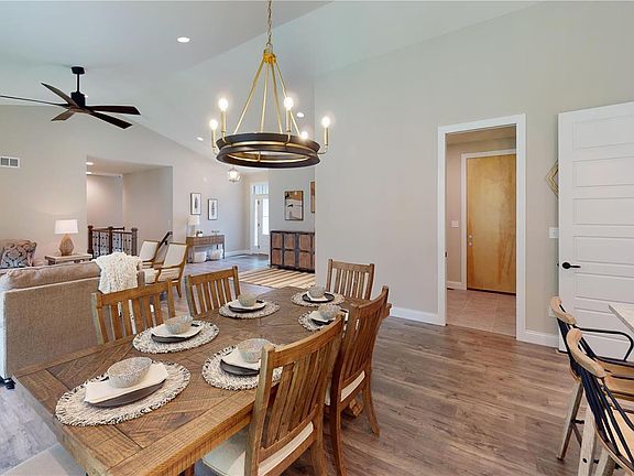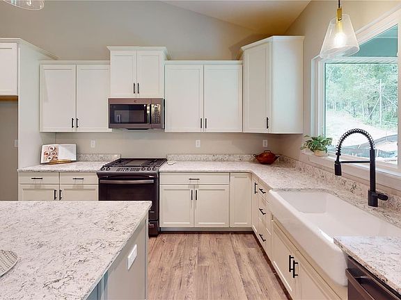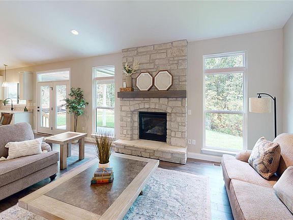 This Ranch home is on a fabulous wooded lot.  This home has a 3-car oversized garage with a 2' extension making it deeper & 8' tall carriage style, insulated garage doors. Features in this home incl. 9' ceilings, Vaulted ceilings in the Great rm, Kitchen & Breakfast rm, Transom windows, Stone Fireplace, Iron Spindles & Laminate Floors. The Kitchen has 42" Staggered, Soft Close Cabinets, w/Crown mold, Deep Pots & Pan Drawers, End Panels, Dbl. Trash Drawer, Cambria Countertops, Kohler, Whitehaven Apron Front Sink, Can Lighting, Under Cabinet Lighting & Powder Rm off the kitchen. The Master Bath has an enlarged shower & frameless swing shower door, Dbl. Bowl, Adult Hght. Vanities, Black Faucets, Upg. Counters & a Coffered Ceiling in the Master Bedroom.  All 3 baths have LVT. Other Features incl. 8' tall 5 Panel Interior doors, Black Levers, 5 1/4" base, 3 1/4" Door Casing, a 20' x 17' covered patio, 9' pour, Irrigation system, Landscaped & Fully Sodded Yard.