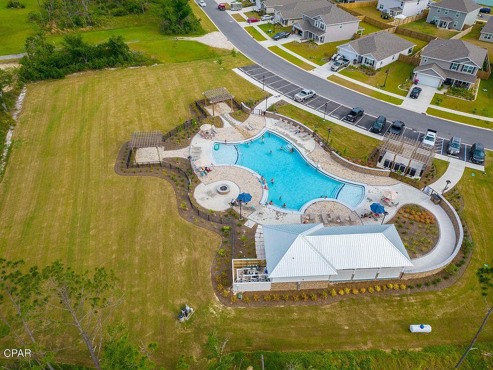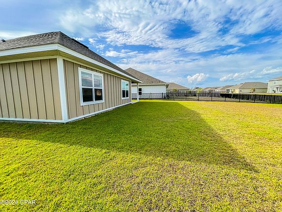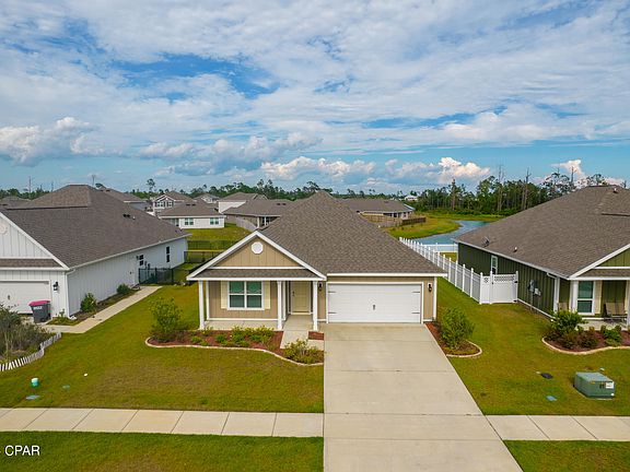 This ''Rhett'' one level home has an open floor plan with a center island overlooking a lush fenced in backyard. Relax under a covered porch while enjoying the water view or walk to the community pool for a swim. Beautiful tray ceilings are in both the living room and master suite. Other details include brushed nickel hardware, granite countertops, elegant doors, smart home features , security system, and a walk in pantry. Primary bath has a separate garden tub / shower and a large walk in closet. 9 foot ceilings, luxury vinyl plank flooring, custom blinds all appliances including washer and dryer are a few more extras this home has to offer. Location is close to Tyndall Air Force Base and a short drive to Mexico Beach. Schedule your showing today. This home is priced to sell!