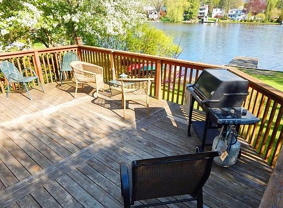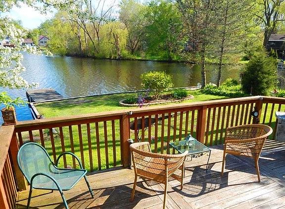 Remodeled, updated & expanded shore-front home on Island Lake. Boat-dock/pier & boat slip. Newly-installed steeling-piling seawall in 2013. Cooks' Kitchen w/Jenn-Air down-draft range w/grill attachment, Jenn-Air stainless-steel oven & dishwasher. Vaulted ceiling. Big Living-Room/Dining-Room combination. Wood-burning fireplace. 4-Season Sun-Room Addition. 1st-floor Bedroom adjacent to Full Bathroom. Clean/Dry basement w/exterior/walkout access. Owner-updated drain-tiles & battery-backup systems. Water heater & 90+efficiency gas/forced-air furnace 2009. Oak Flooring throughout. Maintenance-free vinyl siding. Architectural shingled roof. Brick-Paver walkway/driveway. Abundant professional landscaping. Most windows replaced w/energy-efficient double-pane windows. This outstanding property is well suited to summer-time living, yet has always been structured as a Year-Round residence. A superb location on "Island Lake", with easy navigating and access to the entire waterway.