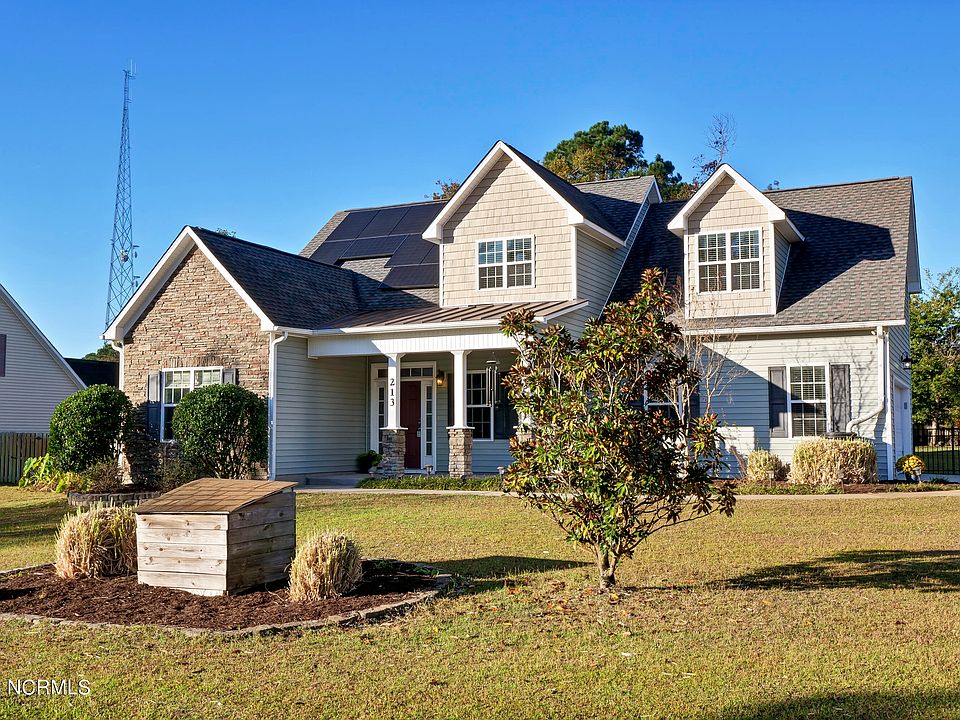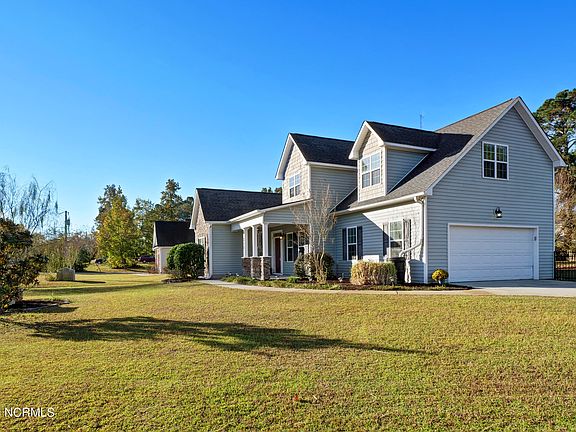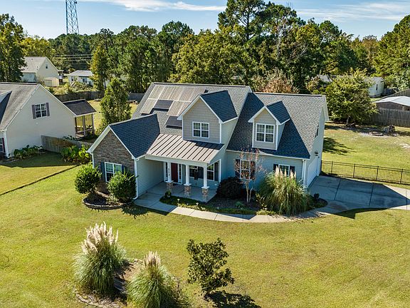 Situated on a sprawling and nearly half acre lot, nestled in Kingsport Subdivision away from the hustle and bustle of Hampstead, this magnificent residence offers 3 spacious bedrooms, 2.5 baths, oversized bonus flex room, two car garage PLUS detached 14X20 workshop with electric. If space is what you're looking for, you have found your home! This charming floor plan features hardwood floors throughout the first floor, main level primary suite, vaulted ceilings in the living room, formal dining room, open kitchen with eat-in area, screened in rear patio overlooking the fully fenced-in and private tree lined back yard. The open living room features a cozy fireplace and gorgeous two story vaulted ceiling offering plenty of natural light. The open kitchen features stainless appliances, plenty of cabinets and counterspace, and boasts an eat-in area with access to a screened in rear patio overlooking the fully fenced in back yard. The primary suite is conveniently located on the main level for extraordinary living and boasts a walk-in closet, dual vanities, large soaker tub, and walk-in shower. Upstairs you will find two more spacious bedrooms, full bath, and an oversized bonus/flex room. Exterior features included a 14X20 detached workshop which has electric, fully fenced in rear yard, and irrigation. This residence is on well water and includes a water softener for convenience. Save money on your electric bill with the installed solar panels! Free from HOA fees and tucked away in the perfect location in Hampstead, offering a unique blend of coastal charm and modern convenience. Perfectly located only a half mile from South Topsail Elementary School and between Topsail Beaches and the vibrant cultural scene and historic charm of Wilmington, this is the home you have been waiting for.