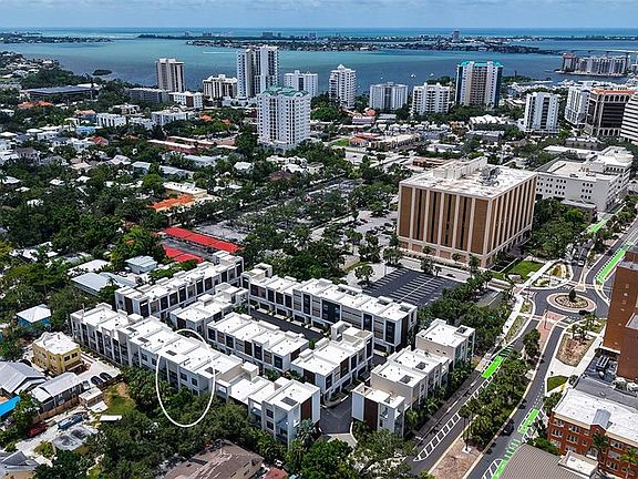 WELCOME Home to The Q an Enclave of 40 Townhomes with varied floorplans, located on Ringling Boulevard in The Heart of Downtown Sarasota without the high fees typically associated with downtown residences! 213 Cosmopolitan Court offers the largest floorplan with three floors of spacious living, one bedroom and en-suite bath along with lovely daytime living space with custom built-in bookshelves off both the first and third floor bedrooms. Each floor of the three floors has one bedroom and en-suite area. All bedrooms have custom built in closet systems. The open space can be used in a variety of ways. Choose to make an office area, a study, a music area, it's your decisions create the best functionality for your lifestyle. Floors one and two have walk out terraces. No neighbors above or below! 913 Cosmopolitan Court is the perfect floorplan for entertaining guest--- designed with a half bath located near the living room. This lovely townhome has a private elevator, two-car garage with a custom finished third floor patio complete with a covered roof top and electric sunshade. The Q enclave includes commercial grade Miami-Dade impact-rated windows and doors, luxurious Lube Italian kitchen and bath cabinetry, Fulgor Milano appliances with natural gas cooktop and Bosch dishwasher, Caesarstone quartz countertops and German Hansgrohe plumbing fixtures. The all-interior doors are solid core, 8-foot-tall dark wood, volume ceilings, a stylish freestanding soaking tub, spacious showers and large closets. Built in ceiling 'invisible' ceiling speakers along with state of the art in home customizable programmable security system. Premium porcelain tile flooring, first and second floor terraces, a tankless hot water system and upgraded water system was installed by owners after the build was completed. 213's bathroom and kitchen areas have been finished in beautifully mosaic tile work throughout. Oversized windows throughout with custom Hunter-Douglas window treatments makes the internal lighting comfortable at all times. The Q community is deeded fee simple, so owners own the land your residence is built on. NO CDD, and the monthly fees are some of the lowest in downtown Sarasota. The location is a quick distance to fine restaurants, specialty stores, banks and opera house, a marina and theatrical arts and two movie theatres. Whole Foods Market, Sprouts grocery, and a weekly year ground Saturday farmer’s market on main street are all in downtown Sarasota. This location is currently Zoned X- which requires no Flood Insurance.