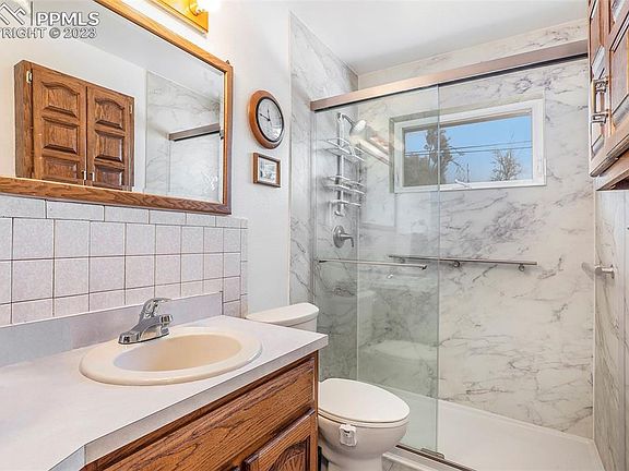 Nestled on an expansive over half-acre lot, this remarkable ranch-style home is a garden lover's paradise, boasting beautifully landscaped gardens, a serene coy pond, and a massive stamped concrete patio. The property also features two outstanding outbuildings, including a detached 4-car garage and an RV garage spacious enough for large coaches or trucks. Inside, you'll be welcomed by gleaming real hardwood floors, leading to a generously sized family room graced with high-quality Marvin windows framing picturesque views of Pikes Peak. The updated kitchen offers solid surface counters, modern appliances, and ample cabinet space, all overlooking the flower-filled fenced backyard. The basement is a treasure, featuring a sprawling rec room with a cozy wood fireplace, two spacious bedrooms, and plenty of additional storage. Car enthusiasts will adore the 30 x 24 detached garage, complete with insulation, finishes, and its own power source. The RV garage is a marvel, with a massive 14-foot-tall door, spacious dimensions, excellent lighting, and top-notch electrical service to meet all your RV needs. Even the resident chicken lives luxuriously in its own enclosed house, delivering fresh eggs daily. With built-in gardens throughout the property for growing fresh vegetables and an array of flowers, this home embodies the epitome of outdoor living. Extremely well-maintained with updated windows, furnace, electrical, roof, and septic, this property is a true gem waiting for its next lucky owner to call it home.