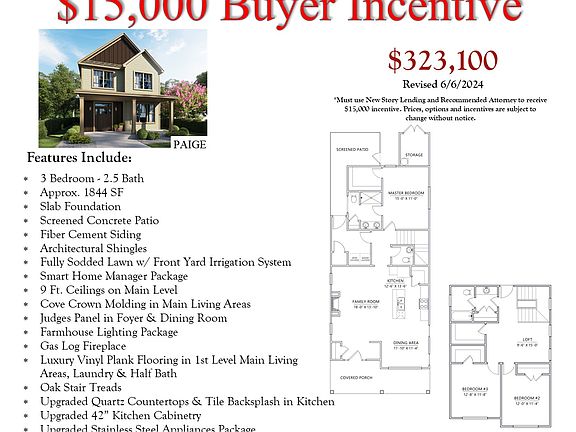 $15,000 Builder Incentive Offered when using our recommended Lender and Closing Attorney!* New Paige Plan in O'Neal Village! 3 Bedroom - 2.5 Bath Approx. 1844 SF. Slab Foundation - Screened Concrete Patio - Fiber Cement Siding - Architectural Shingles - Fully Sodded Lawn w/ Front Yard Irrigation System - Smart Home Manager Package - 9 Ft. Ceilings on Main Level - Cove Crown Molding in Main Living Areas - Judges Panel in Foyer & Dining Room - Farmhouse Lighting Package - Gas Log Fireplace - Luxury Vinyl Plank Flooring in 1st Level Main Living Areas, Laundry & Half Bath - Oak Stair Treads. Kitchen Features: Upgraded Quartz Countertops & Tile Backsplash in Kitchen Features: Upgraded 42" Kitchen Cabinetry, Upgraded Stainless Steel Appliances Package. Quartz Countertops in All Full Baths - Ceramic Tile Flooring in All Baths - Double Sinks & Ceramic Tile Shower w/ Frameless Shower Door in Master Bath. 1 + 8 Builder Warranty Included