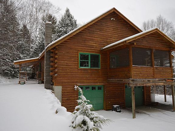 Gorgeous log home with open floor plan, entry with ceramic tile, hardwood floors, huge kitchen, wood stove in the living room (primary source of heat.) Sliders off all the rooms to the deck.Master suite with closet, bathroom and laundry. 2 Screened in Porches 13 x 13. Whole house generator, 4 waterfalls on the property, and waterfront along the stream. Lower level full size windows, family room, 2 bedrooms and full bath. over sized garage and beautiful gardens surround it. Privacy galore on 136 acres! Perfect getaway from the city.
