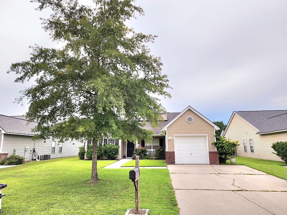 This immaculate 3bd 2ba ranch home has lots of character. Solar panels will be removed and a new Architectual roof installed before closing. Home has updated flooring(tile and hardwoods) throughout living areas and master. New HVAC inside and outside replaced 2022. Newer stainless steel appliances installed in 2020. Home has some additional upgrades done in 2022 new door knobs, faucets, & 2'' plantation blinds. Custom built ins w/shelving, mantle, and fireplace. Shiplap walls in master and living area. Custom wooden barn truss installed in elevated ceiling between living rm and kitchen. Added storage above garage with flooring. This home is conveniently located close to I26, Nexton and azeala square. 6ft wooden privacy fenced with great size backyard. Community offers pool, club house,