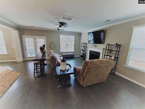 - RoomLivingRoomFeatures: Fireplace, French Doors, Molding, Floors-Laminate, Ceilings-High (over 9 Ft), Ceiling Fan