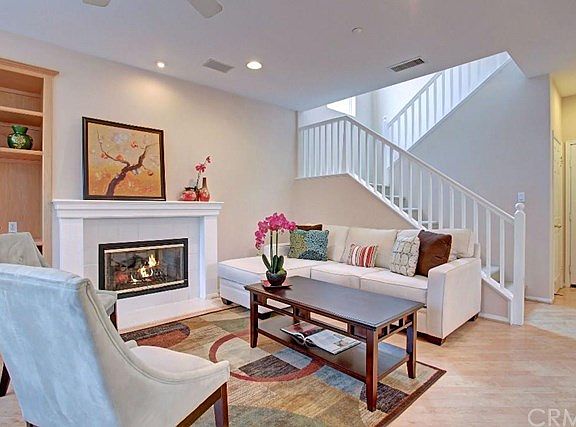 Beautiful move-in ready detached home shines with upgrades throughout. Enter into the sizable living area with stately fireplace, recessed lighting, fresh neutral paint scheme, surround sound system, and new light catching windows. Gorgeous hardwood laminate floors grace the entirety of the first level and plush carpet upstairs. A separate dining area seamlessly flows into the well-appointed remodeled kitchen with Granite counters, and matching new stainless steel appliances. Huge loft upstairs is great added space. The inviting master suite has an expansive closet, and a serene en suite bathroom with separate shower, deep soaking tub, and dual mirrored vanities. The secondary bedrooms all have sliding closet doors and close proximity to the remodeled bathroom. Enjoy relaxing in the low maintenance backyard with stone patio and lemon and orange trees. Myriad entertainment and cultural options in close proximity make for enjoyable Orange County living.
