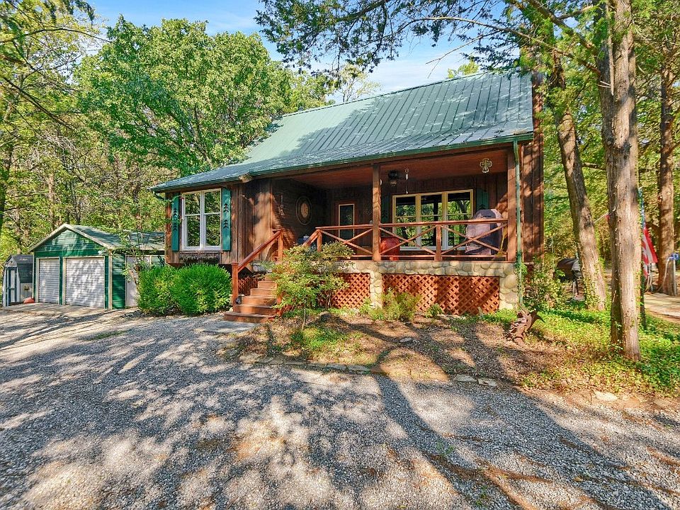 Quaint and cozy cabin in the woods! Surrounded by beautiful mature trees, this home has two bedrooms, two full bathrooms, PLUS an ADDITIONAL ROOM perfect for a small office or set of bunk beds. As you enter the home from the covered front porch, you are welcomed into a grand living room with a stone fireplace surrounded by pine wood tongue and groove walls and ceilings. Gorgeous kitchen area with an abundance of cabinet and countertop space, an eat-in island, black appliances, and granite countertops. Good sized dining space with hutch included. Upstairs loft area includes a bedroom with walk-in closets and an ensuite bath. Enjoy the nature views from every window in the home. Quality finishes throughout the home with Anderson windows and a metal roof. Relax and unwind from the day in your very own hot tub on the back deck or sit around the fire-pit under the trees! Detached garage perfect for lake toys, lawn equipment or a workshop. Lush landscaping and grounds with circle drive.