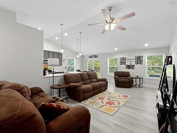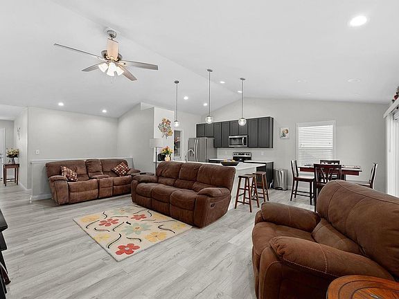 This 4 yr old 3bed/2 bath Ranch is beautiful. If you are looking for a brand new home but don't want to wait for it to be built this is the one to see. Upgrades galore! Rounded corners, granite countertops, stainless steel appliances, 42" cabinets, framed windows, taller baseboards, adult-sized cabinets in bathrooms with marble countertops, upgraded carriage doors on an oversized 3-car garage with 8ft doors and up too 22 ft long inside, panel doors, canned lighting fixtures throughout the house! As you enter to the foyer, you walk in to the open living room with vaulted ceilings. The gorgeous kitchen with white granite counter tops with tons of space.  Off the eat in kitchen is sliding glass doors to the back patio which backs to trees. Main floor laundry off the kitchen to the huge 3 car garage. Master bath has a separate shower and whirlpool tub. There is also a light switch in front closet that controls outside lights. This house is a MUST SEE!