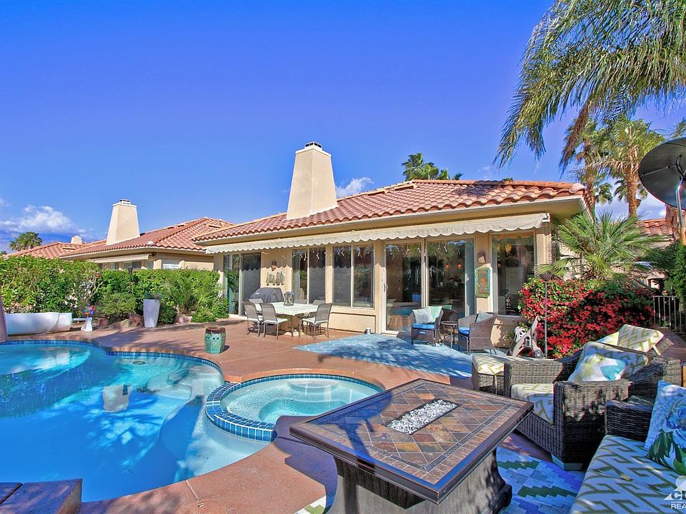 Location, location, location! Convenient to all that the Desert has to offer. Close to the airport, major shopping, restaurants, cinemas, Eisenhower medical center & more. Quiet location on outside loop, beautiful mountain views, south facing within the upscale guard gated community of Rancho Mirage Country Club. Get in on exciting redevelopment with a boutique hotel, restaurants and brand new executive 18 hole golf course. This will be a jewel in the desert! Spacious, well laid out, 3BD 3BA 2150 Sq Ft home, with updated kitchen, extra illuminated cabinets, new flooring throughout & beautiful landscaped yard with pool & hot tub. Beautiful etched glass front doors, huge master bedroom, walk-in closets & numerous solar tubes for great light. Fire table, heaters, outdoor furniture, and large full house width retractable awning make the outdoor space usable year round. Come and see why this truly is the playground of the Presidents!