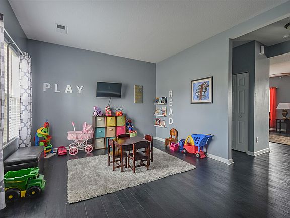 Kitchen is the star here, New dark distressed wood style flooring covers 1st floor-Tall Upper Cabinets in dark brown stain & High Ceilings plus Full Pantry, Island, & Extra Cabinetry, Black Appliances including Refrigerator w/water+ice is really Functional & Beautiful. Stretched- out eat-in area accommodates long rectangle table seating 10 easily! Open to Great Room, New Flooring & Neutral Grey freshly painted walls. Downstairs has a Versatile Room, use as living room/ office/playroom (currently used) or dining room...whatever you need. New Nice Carpeting blankets stairs and 2nd Floor. Master is large w/Treyed Ceiling plus Walk-In. Upstairs is open w/ LOFT-BONUS . Laundry has cabinetry. Garage Oversized. House is Fresh and Bright and located on a Culdesac. Nice distance POOL is great. Neighborhood is tucked away and just 2 minutes to Shopping Grocery Plaza and less than 4 minutes to I-20. Well Maintained, Move In Ready Now. Termite Bond in place. Extra Patio too. No down payment is possible, inquire with listing agent for details.