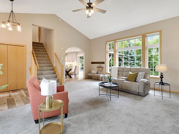 The vaulted great room impresses with its tiled fireplace and soaring windows that flood the space with natural light. A spacious main-level laundry and mudroom with built-in storage add everyday convenience. Upstairs, you’ll find three bedrooms, including a primary suite with a walk-in closet and private ¾ bath, along with an updated hall bath.