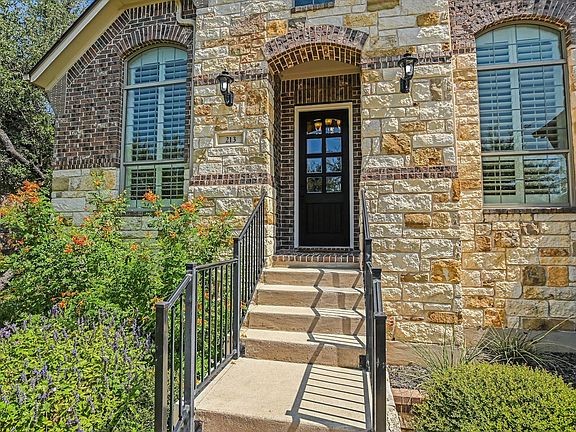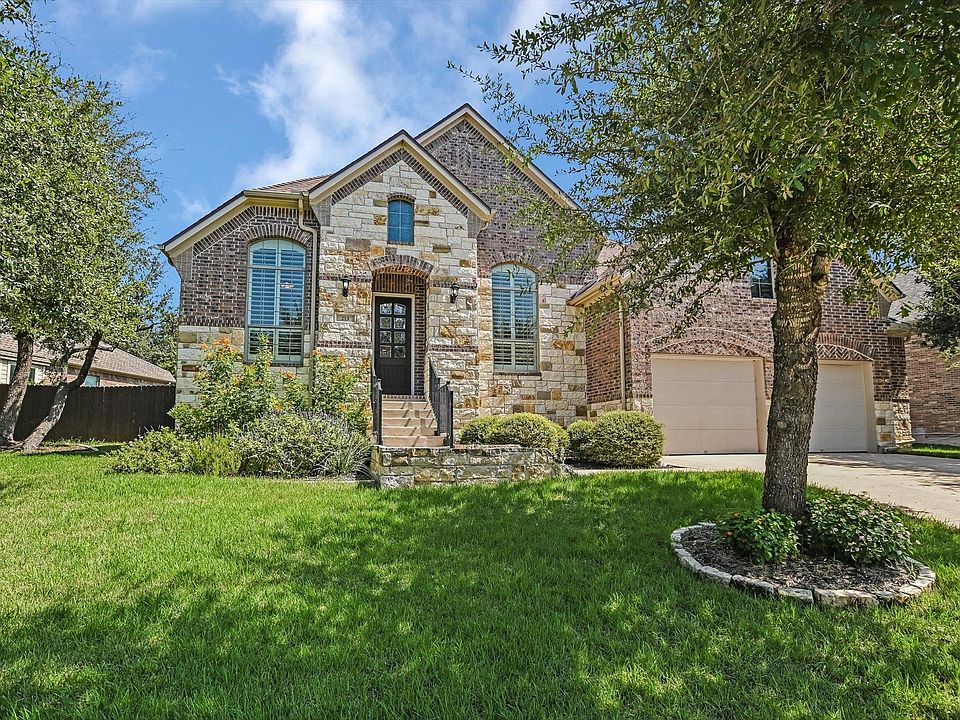 Lovely French inspired stone and brick home in popular Belterra. Lots of recent updates, including dual inline tankless water heaters, a 2022 Carrier 5 ton HVAC and ductwork, fencing, sprinkler system, 2025 roof shingles, Bosch dishwasher, Kitchen Aid cooktop, exterior vented hood, updated lighting and ceiling fans. All bedroom closets and the garage have been equipped with custom closet storage systems. Lives like a 1 story with 4 bedrooms plus a study on the main level with a gameroom and full bathroom upstairs (could be 5th bedroom). The grand 8' front door welcomes you to this beautiful home. The home office features French Doors, vaulted ceiling, and a large window. The Dining Room is a stunning focal point for the home with a gorgeous chandelier and dramatic draperies. The kitchen is open to the Living Room and features gorgeous knotty alder cabinetry, stainless appliances, granite counters, and even under-counter lighting. The large center island makes a wonderful gathering space when entertaining. The Living Room includes a lovely stone fireplace and a built-in entertainment cabinet for your large-screen TV. The covered back porch welcomes you to sit a while in shady comfort with a ceiling fan to keep the breezes blowing and a built-in outdoor kitchen area. There's also an uncovered patio, perfect for a small firepit or for soaking up the rays. The yard is beautifully landscaped with lush plants that provide some privacy from adjacent neighbors. Want a pool? Pool plans available! This home has been meticulously maintained and it shows!