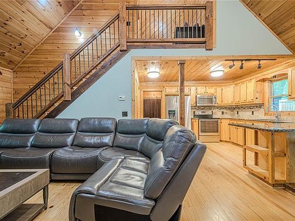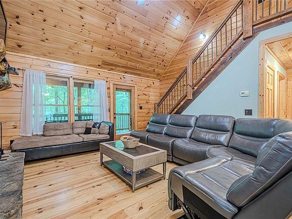 Stunning renovated cabin just minutes from downtown Blue Ridge!! Full bedroom and full bath with porch access on each level. Beautiful open kitchen with granite countertops, stainless appliances & cozy open concept dining area surrounded by windows and access to porch. The great room features vaulted ceiling and magnificent stone fireplace with gas logs. Full finished basement with game area, bar, family room, bedroom & bath. Wrap around porch, hot tub & fire pit complete this gorgeous mountain cabin surrounded by nature. Already in a rental program - perfect for vacation home, rental, or primary residence! Close to shopping, restaurants, Lake Blue Ridge & more! Furniture available with extra charge.