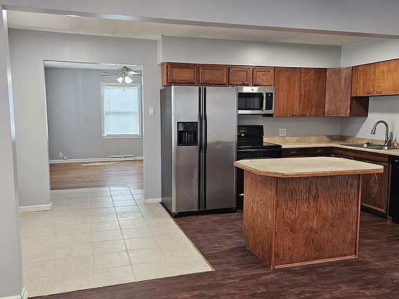 Nice 3 Bedroom, 1 bath House in small quiet town setting of Douglass, Kansas. Open concept living Kitchen & Family Room, with additional living/family room. New Heating and Air, New windows . Wood floors, tiled entry, ceiling fans, Fenced and shaded back yard w/deck (partially covered) and Large 24x36 Garage/workshop accessible from alley. Appliances furnished (Refrig, Washer, Dryer, Dishwasher, Glass top Range, Microwave above Range. Pet friendly with conditions, terms and additional fees.