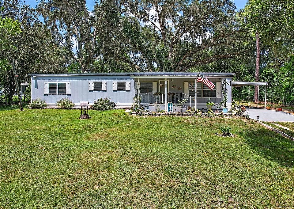 This charming manufactured home is nestled on almost 3/4 acre of picturesque land, providing ample space for all your desires. The property boasts a new mini-split HVAC system, ensuring your comfort in all seasons and brand new laminate flooring throughout the living areas and new vinyl flooring in kitchen and baths. Step inside, and you'll discover a well-designed layout featuring three bedrooms and two bathrooms with built in storage, offering both convenience and privacy for you and your family. The home also boasts an inside utility room, making household tasks a breeze, and a convenient storage room attached to the house for all your belongings. If you love tinkering and working on DIY projects, you'll be thrilled with the included work shed, providing a perfect space to bring your creative ideas to life. Additionally, there's container storage available, ensuring you have plenty of room for stowing away those extra items. Parking is never an issue here, with a one-car carport conveniently attached to the home and additional covered parking in the rear. Whether you have multiple vehicles, a boat, or an RV, there's plenty of space for all your toys. Another fantastic perk of this property is its location – no HOA restrictions mean you have the freedom to personalize your space to suit your lifestyle. Situated in Lady Lake, close to The Villages, you'll have easy access to top-notch shopping, dining, and entertainment options, making weekends full of fun and relaxation. In summary, this manufactured home on a generous plot of land offers all the essentials and more for a comfortable, enjoyable, and unrestricted living experience. Don't miss the opportunity to make this home yours and indulge in the convenience it has to offer. Come and discover the perfect blend of modern living and a country lifestyle today!