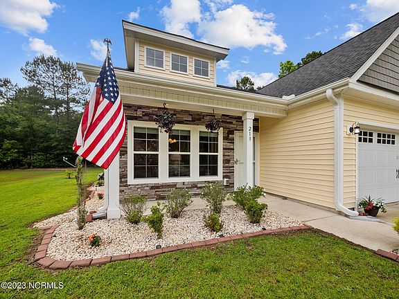 PRICED REDUCED TO SELL! Summer is going to be sensational at 213 Peters Lane Jacksonville, NC so don't wait make it yours! Step inside the desirable subdivision of Blue Creek Estates and Southwest School District! Sitting on just shy of one acre this home features roughly 1460 sqft and has 3 bedrooms and 2 full bathrooms. Security is top notch at this home with a variety of exterior cameras and a secure locking door just in time for hurricane season! This like new home is top of the line from inside to the outside. The tall ceilings and open layout provides a sense of comfort. Be sure to check out the large shed in the backyard! Conveniently located to the beaches and the bases! This home is ready for you to call it home!
