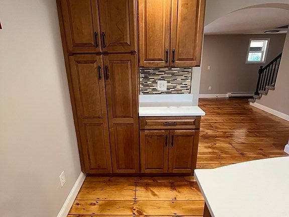 This beautifully modern farmhouse cape cod home, sits back from the road in a private setting, surrounded by mature trees and plantings. The home showcases, newly refinished wide-plank, pine floors, a gourmet kitchen with quartz countertops, as well as an oversized garage with a wood stove for those chilly days. A mechanics/hobbyist's dream, there is plenty of space and storage room for any and all toys in the oversized garage with a 10' door. If you own a bus, you can park it here. This home has many special features, including front deck, front screened in porch, three bedrooms, one on first floor with door leading to a sunny solarium with potential for a hot tub, meditation room, or a healthy plant haven! There is a first-floor full bath with shower, a living room with a gas stove, dining room, large entryway/mudroom with closet and sunken family room. The other two large bedrooms are on the second floor and share a full bath. This home also has a huge fenced in backyard.