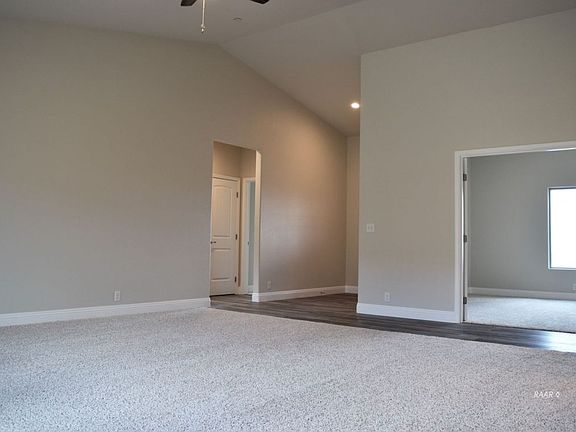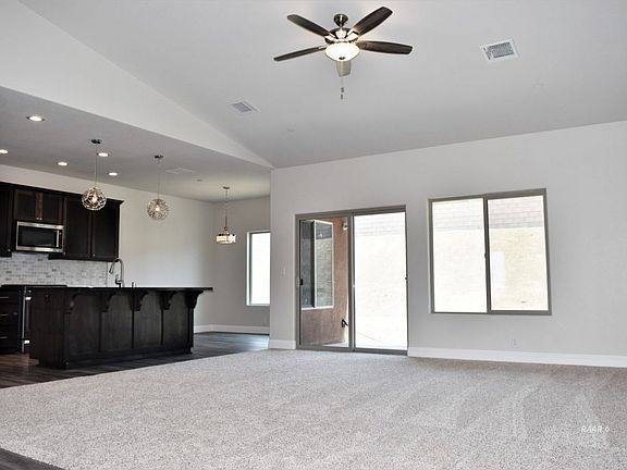 This home currently under construction provides 1,875 sqft. With form and function in mind, amenities include quartz counter tops in the kitchen and bathrooms and tile flooring in the entry, kitchen, nook, bathrooms, hallways and laundry. The towering 9ft ceilings throughout the home and vaulted ceiling in the great room and option room provide openess. The carpet and ceiling fans add comfort to all bedrooms, the great room and option room. The split floor plan provides privacy with a master suite featuring a double vanity, 5 ft soaking tub and 5 ft fiberglass shower, walk-in & privacy closets. The front option room has potential as 4th bedroom, partially open den/office or 2nd dining area.There is an indoor laundry room. 2 car finished garage has an automatic opener. R-38 insulation in the attic & R-19. 96% hi-efficiency forced air heater. Ground mounted AC unit Seer 14. Natural gas water heater. Energy efficient windows and lighting. There is a fire suppression system in the ceiling. A fully trussed covered patio helps to keep it cool. Block wall and metal side gate.