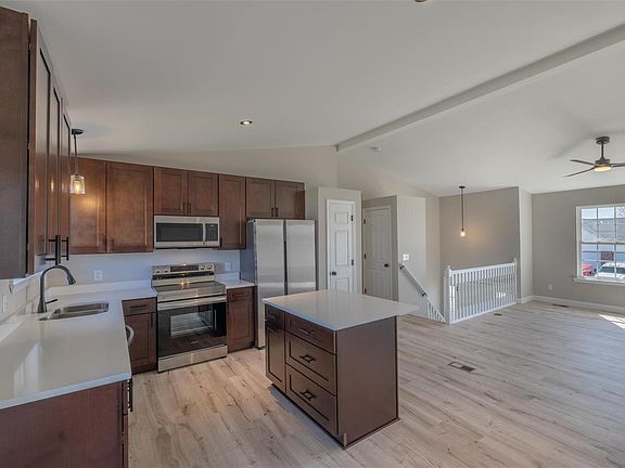 This newly renovated home boasts a fresh and modern appeal with new laminate flooring and carpet throughout. The kitchen has been completely remodeled with brand-new appliances, quartz countertops, and custom cabinetry. Each of the three bathrooms has been upgraded with new plumbing fixtures, vanities, mirrors, and lighting. A new water heater ensures efficiency, while fresh paint covers every inch of the interior. The garage offers extra depth, new paint, lighting, and built-in storage and workshop space. The lower level family room includes its own bathroom, potentially convertible into a mother-in-law suite. Outside, the exterior showcases charming stone and brick accents, including a stone mailbox, all situated on an oversized, partially fenced lot for added privacy and space.