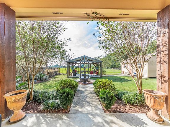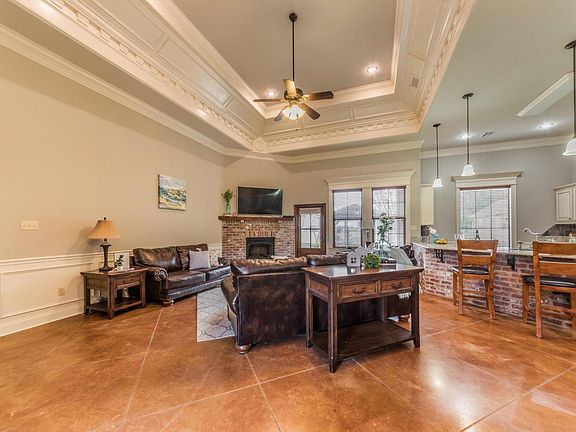 There arent many homes out there with grand outdoor living space in this price range, so dont miss out! In the words of the seller, I spend all of my time out there! Football games, family gatherings, or unwinding from the day--the space is accommodating for your needs. Welcome home to a beautifully done immaculate custom home in The Cove at Oakridge. A beautifully inviting entrance, the front door welcomes you to a large open concept kitchen, dining, and living area. Its hard to miss out on all the custom detail just opening the front door--stained and scored concrete with fleur de lis detail, exquisite ceiling detail, calming neutral colors and a welcoming brick fireplace corner set in the room.The kitchen bar area is designed for guest seating while you make your way around the spacious kitchen area preparing a meal on the abundance of countertop space. The dining area is large enough for large dining and storage pieces. The bedrooms are situated on a split floor plan with the master wing on the right side of the house. Master bedroom is spacious with an en suite master bath featuring double sinks, separate shower/tub, and large walk in closet. Secondary bedrooms are spacious and share a bathroom. The backyard area is its own inviting custom space with a fountain, large covered gazebo with electricity and a storage building. Rear yard access to the storage building gives you space to park your toys and storage on the property so you can get rid of your monthly storage unit bill. The driveway and deep and wide for plenty of cars. Schedule your showing today!