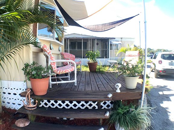 This well loved charming fully furnished 2 bedroom 1 bath home sits on leased land in the adult park of River Forest in Titusville, Fl. Current monthly lot rent is $395 ($420 June 1 2019) which includes, water, sewage, trash/recycle. The park offers boat access to the Indian River, with fishing dock available with fantastic views of the space industry rocket launches! Features of home: -Great Location; near Kennedy Space Center, beaches, Port Canaveral -Home has been well cared for with many updates -Nicely Landscaped -Front porch deck with pretty water views -Screened porch is furnished with new screens and doors -Outdoor patio for grilling -Storage shed available -Updated kitchen with appliances -Freshly painted -Entire Bathroom has been renovated -Mini Split AC/Heater/Dehumidifier -Most Furnishings as pictured remain -Including 2 TV's -Newer laminate flooring -4 Ceiling fans -Unique lighting **Little about River Forest** This 55+ adult park sit on US 1 in South Titusville, FL. The park faces the Indian River and offers enjoyment of wildlife,fishing, rocket viewings. On-site is also a laundry facility, shuffleboard court and dock area. The park does not have a clubhouse, just the office. current lot rent is $395 ($420 June 1 2019) which includes water, sewage, and trash. Small animal may be allowed with approval