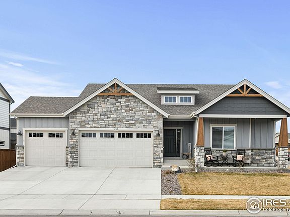 Ranch home better then new with main level living and mountain views with many great spaces for entertaining. Welcome to the Farmstead community, a No Metro Tax neighborhood with an HOA($65/month) that pays for non-potable irrigation water, a pool coming this year and destination size adaptive park opening this year as well. Relax on the front porch with coffee or come inside and sit by the fireplace in the winter while looking out the windows enjoying the mountain views. Your kitchen has a large center quartz island, slow close cabinets, ss appliances, and walk in pantry. Primary bedroom tucked in back for privacy and 2 additional upstairs bedrooms with a jack n jill bath. Venture downstairs to enjoy the large recreation room, wet bar is perfect for gathering and large media area Dolby Atmos surround sound. Additional 4th spacious bedroom downstairs and a full bath. 3 car garage with EV prewire. The extended covered back patio, gas line for grilling and firepit area with unobstructed mtn views are great for watching the sunset over the Rocky Mountains. Berthoud has many community activities, hometown pride supporting our desirable schools and lakes, parks and downtown local businesses to enjoy.