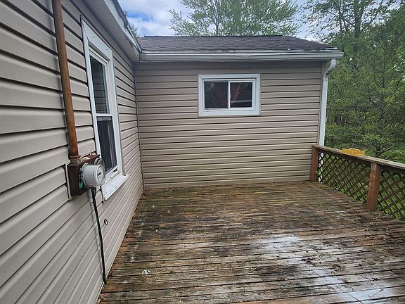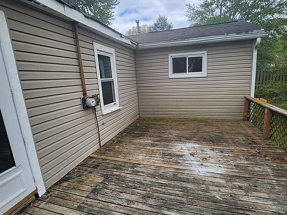 2 Bedroom home with lots of possibilities. Open front porch, eat-in kitchen, separate laundry area, some wood floors. Wood deck off the back of home. 1 car detached garage and a fenced backyard. THis would make a great rental or fix up and live in it.