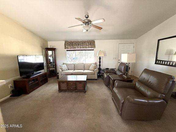 Original snowbird owners (in Sierra Vista only 5-1/2 months each year) are selling their manufactured home located in a park and sits on leased land. The home is well maintained and completely furnished and equipped, move in ready. There is an open concept adjoining the living room, kitchen and dining room with a split layout for the primary bedroom with a walk-in closet and bathroom with an acrylic step in shower 51''x41'' at one end and the other two bedrooms and family bathroom at the other end of the home. The eat-in kitchen is equipped with quality appliances such as recently purchased Bosch dishwasher, Samsung fridge, GE gas stove, over stove microwave, and the laundry room has brand new LG washer and dryer. Heating and cooling by a Carrier Pack. Visit soon to see the great value.