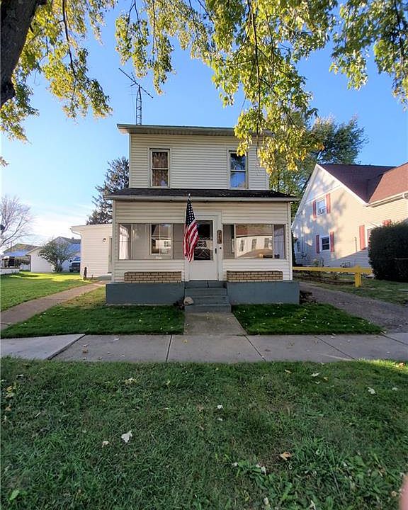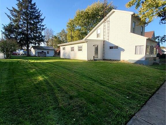 Enjoy small town life in this 4 bedroom home with 1506 sq ft and lots of character. The front of the home is accented with large brick planters boxes, spacious side yard, covered patio 12 x15, large cement parking pad and 3 car garage. Inside enter through the enclosed porch into the living room accented by wood floors, decorative fireplace (inoperable) with built-in bookcase with storage. You will love the country kitchen with lots of cupboards, stove and refrigerator included. Family rm/Dining rm has wood lap walls, Master BR offers large walk in closet, full bath and utility area are also on the first floor. Upstairs find 3 additional bedrooms all with nice closet spaces. Partial basement holds the mechanicals. Home still needs some TLC but most the work is done.