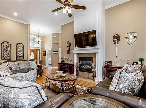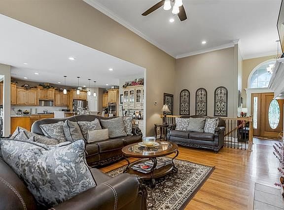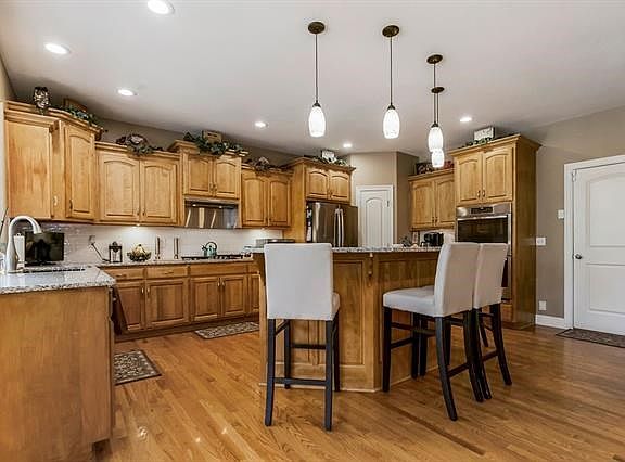 Nestled in a quiet cul-de-sac surrounded by mature trees lies a hidden oasis. Inside you will find high vaulted ceilings & magnificent crown molding throughout, w/ arched windows that frame your picturesque landscape through custom wood blinds. Hardwood and tile adorn the upper level, with carpet in the bedrooms. The upper full deck overlooks the HEATED 38ft x 18ft SALTWATER POOL! Pool heated to 86-90 degrees allows you to swim into mid-November. The saltwater is low maintenance & easier on the skin and eyes. For ease of use, the pool comes with an electric cover. At night, the LED light makes the pool glow a 'resort style' blue. A peaceful blue, 15ft- high, circular fountain radiates up in the center. The Illuminated palm trees & fire pits surround the entertaining area and provide a warm glow. Relax in the 8 to 10-person hot tub. Apple, Peach, and Nectarine trees provide the saltwater pool filter, pump, and heater both protection and shade. When it's time to entertain, this same backdrop comes to life (with 24 high power speakers and 7 subwoofers that surround the back yard, and immerse you in the sounds of music, sports, or movies). With 2 Smart Roku enhanced, HD projectors (fixed and installed outside), you have the option of watching sports or movies outside under the deck, on an automated drop down 150' (12.5 ft. wide) screen, or you could watch the same platforms from above or below the deck, on the included 20ft movie screen, that overlooks the pool. (Nothing more fun than swimming in a heated and illuminated pool at night, while watching the KC Chiefs, the Royals, or movies like Jaws, on a 20ft. screen).Included inside, within the 9ft ceilings downstairs, is a full HDR, Dolby Atmos, Dolby X, active 3D and 4K, 10 ft.-wide Media and Movie Screen. High powered Klipsch speakers provide full 7 speaker surround with Atmos overhead. A full bar with neon accents, acts as a concession stand for your entertaining pleasure. 2022-08-10