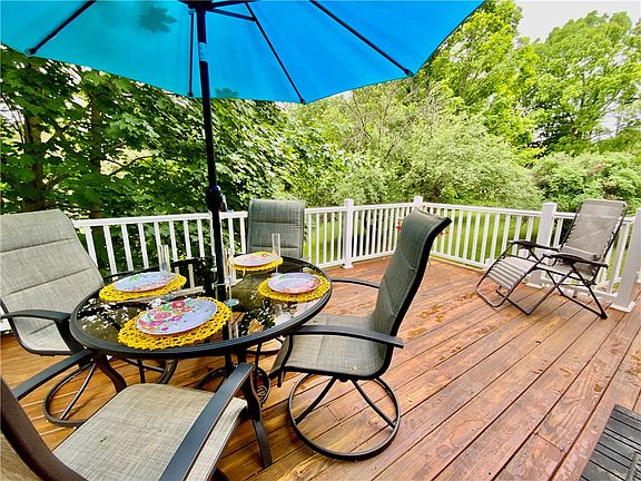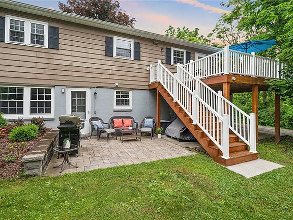 Welcome home to this charming 3-bedroom, 2-full-bath raised ranch nestled on 3 acres of park-like grounds. The spacious main living area boasts an inviting open concept w/ a seamless flow between the living and dining spaces, highlighted by hardwood floors. The kitchen is open and bright w/ ample counter space, updated appliances, and a relaxing view of the backyard. Step out from the dining area onto a beautiful deck, perfect for morning coffee or evening relaxation, with stairs leading down to a flagstone patio ideal for grilling and entertaining. Three comfortable bedrooms can be found on the main level, including a generously sized primary suite w/ double closets. A large shared bath is convenient with laundry and storage. The cozy lower level provides a charming family room, perfect for movie nights or gatherings, as well as an additional versatile space that can serve as a game room or workout area. Don’t miss all the lower-level storage rooms and a small craft area for DIY projects. This beautiful property features lovely plantings and mature trees, creating a picturesque and tranquil setting. Only 5 miles to downtown, don’t miss this opportunity to own a piece of paradise!