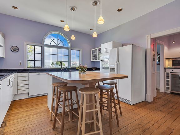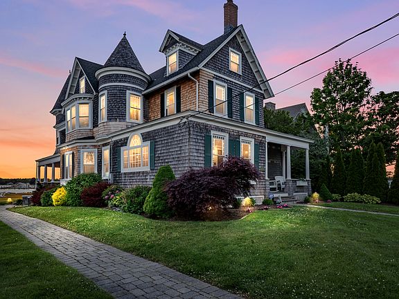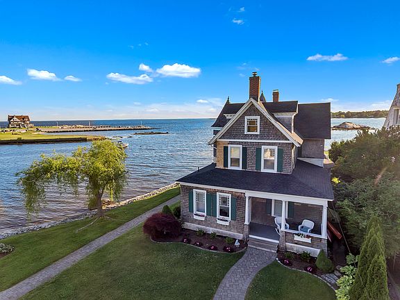 NEW PRICE!! WON'T LAST LONG! An Eastern Point Gem - Designed and built in 1895. The National Register of Historic Places states "213 Shore is probably the finest Shingle Style house in the district." This amazing year-round, traditional cedar shingle home with wrap-around porches offers 180 degrees of waterfront and enjoys views of the Zbierski House and Long Island Sound. Plenty of room for family gatherings with four bedrooms and three full and two half baths! Entertain in the bright, open kitchen with custom cabinets, a glass paneled butler's pantry and center island with granite counters! Stunning formal dining room with custom wainscoting leads into a spectacular living room with corner fireplace looking out onto the mouth of the Thames river. The family room area has a built-in window seat and stained glass. Enjoy your morning coffee in the cozy sitting area in the master bedroom overlooking the water. Need more room? Finished third floor offers endless possibilities, current owner is using it as four additional bedrooms. Beautiful architectural details inside and out. The sweeping waterfront lawn has lovely gardens and the property also offers a mooring for boaters. Schedule a showing or virtual showing today!