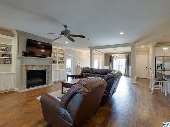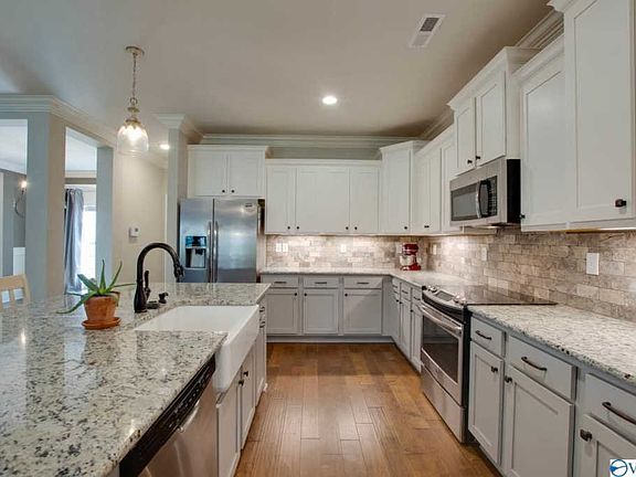 Coming Soon! Active 11/1. Beautiful, brick 4 bedroom/2 bath ranch. Open floor concept with hints of farmhouse style throughout the home. Handscraped wood floors with tile in the wet areas. Carpeted bedrooms. Gorgeous stacked stone fireplace has decorative molding and built in shelving. Kitchen features granite counter tops, large island with farmhouse sink, tile backsplash and painted cabinets. Isolated Master Suite with huge glamour bath and oversized walk-in closet. Backyard features private, wooded view with privacy fence. Storm shelter located in garage. Short drive to I565 which will take you to Redstone, Downtown and many other areas of the city. Community pool, clubhouse a