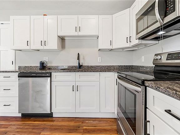 This updated 2-bedroom, 1-bath bungalow offers a fresh, modern touch while maintaining its charming character. The home has been updated with stylish finishes, including new flooring, fresh paint, and contemporary fixtures throughout. The living room is enhanced with modern lighting and 2 windows that flood the space with natural light. The kitchen has been fully upgraded with stainless steel appliances, granite countertops, and self-closing cabinetry, making it perfect for cooking and entertaining. Both bedrooms have been updated with new flooring and fixtures, creating cozy and inviting retreats. The bathroom has been remodeled with a clean, modern design featuring a beautiful vanity and new hardware. The exterior has also been refreshed, with a well-kept fenced yard perfect for outdoor gatherings, vinyl siding, a shed, and a large deck. This bungalow blends classic appeal with modern upgrades, offering the perfect space for comfortable living.