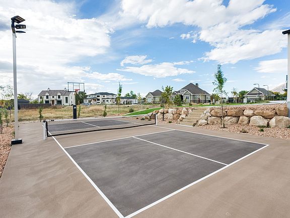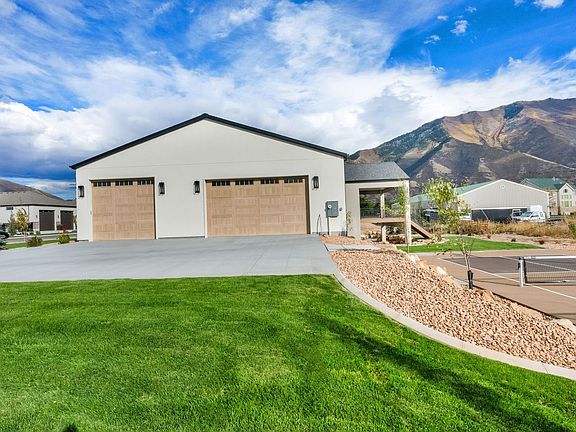 **Full Landscaping included and complete** Nestled inside Maple Leaf Cove, one of Mapleton's highly desired and premier developments, sits this spectacular luxury residence on a half-acre lot with southeast views of Utah's majestic Wasatch Mountains! Enter in the front door into the light and airy foyer leading to your open concept kitchen/great room and you won't know what to focus on first... the spectacular chef's kitchen with quartz countertops, top-tier appliances, an oversized butler's pantry, and soft close cabinetry that goes all the way up to your 10' ceilings?! Or the beautiful stone fireplace in the great room with handcrafted ceiling beams overhead? Or perhaps it's the massive 8' x 14' glass sliders that give way to your indoor/outdoor space with covered deck? Whatever it is, this home is a show-stopper, and the impressive finish work and quality of materials doesn't stop there. The spacious primary retreat absorbs the west side of the main floor and features "his and hers" walk-in closets w/laundry and a well-appointed ensuite bathroom equipped with heated tile floors, and a massive euro-glass shower/steam room and separate tub all in one! Own an RV, boat, and/or any other toys? This home has you covered for all of it with the potential for an RV pad, and an oversized, fully finished, epoxied, 1,421 sq ft., 5 car garage that includes a 220V outlet for electric vehicle charging! But that's not all...the unfinished walk-out basement is designed and framed with 9' ceilings and spaces for another full kitchen, gym, family room, 2nd office, 3 more bedrooms, 3 more bathrooms, and a laundry room with the potential for a mother-in-law apartment or ADU. Last but not least, looking for some great exercise and quality time spent with friends and family? Look no further than your outdoor, lighted, half-court basketball/full-size pickle ball court! In addition, your entertainer's backyard includes a waterfall feature running down your rock retaining walls and a cozy fire feature to gather around. Enjoy the tranquility and peace of this spectacular neighborhood and uplifting mountain views yet appreciate its convenient location to many amenities including Costco, Walmart, Cinemark movie theater, schools, freeway access and more.