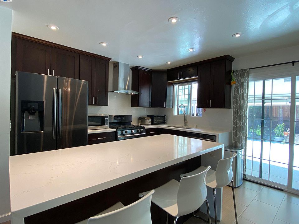 Beautiful, upgraded single-story home with a large back yard! Spacious open floor plan. Hardwood flooring through-out. Large living room with newer front door and recessed lights. Spacious, upgraded kitchen with nice cabinets, beautiful quartz countertops and big island, and stainless steel appliances including a big French door refrigerator. Nice dining area with a pretty chandelier. Upgraded bathrooms with quartz vanity tops, beautiful tiled walls, and fancy shower heads. Light & bright with all newer dual-pane windows and sliding door. Newer central air conditioning & central heating system. Nice finished garage. Large backyard with a big covered patio, some new fence sections, and several mature fruit trees, great for entertainment. Conveniently located near BART, freeway, schools, shopping, restaurants. Great for commuters working in Bay Area. See it now! Hurry! It won't last long!