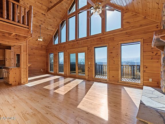 The main floor has a master suite with a walk-in shower, deep whirlpool jet tub, double sink, and walk-in closet; a half bath off of the kitchen and living room area, & propane gas stone fireplace. From the living room, walk out onto the wrap around porch overlooking the gorgeous view of The Great Smoky Mountains. There is a newly screened in area on one side of the porch.